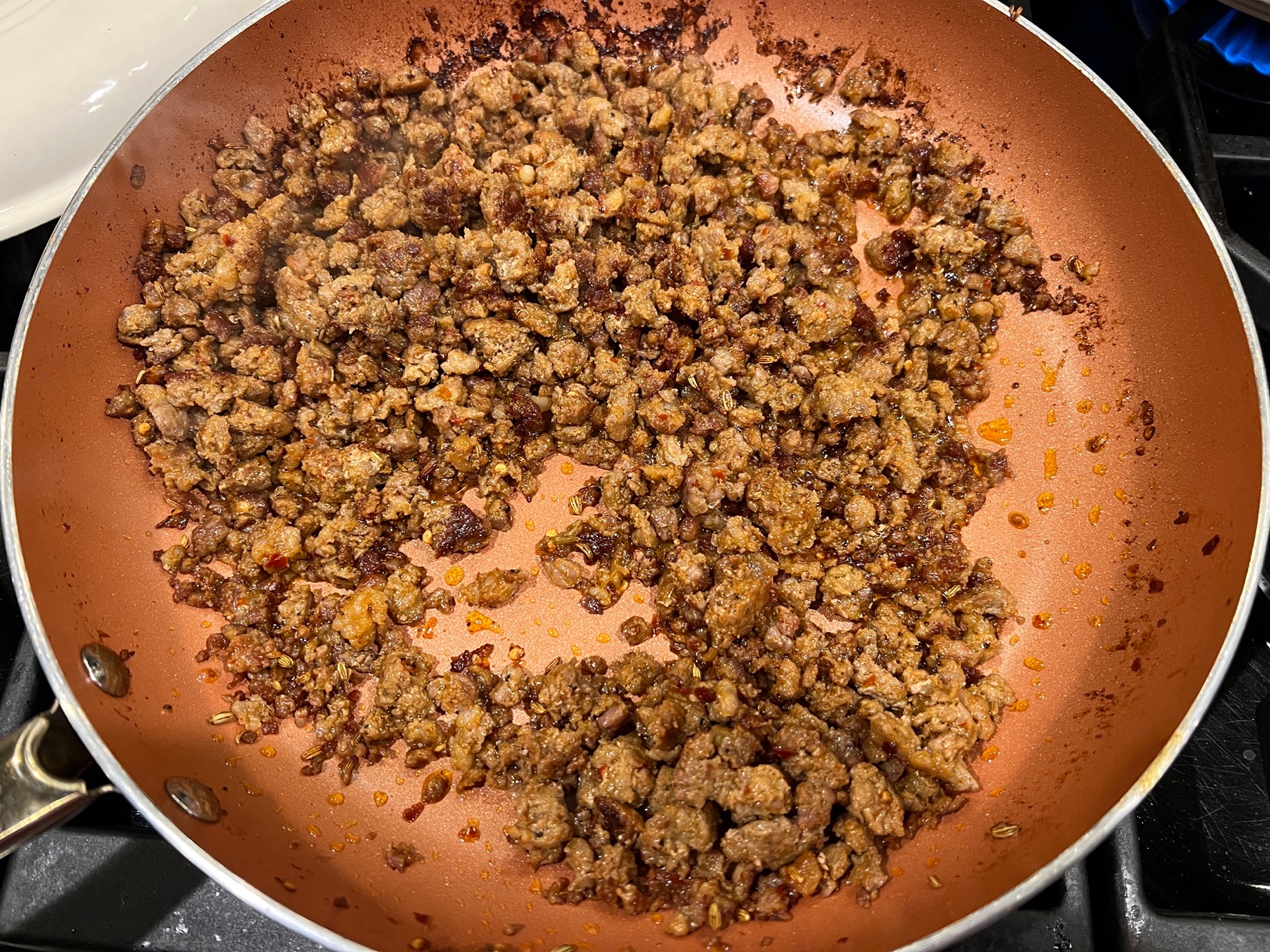 2. As the water is coming to a boil, heat a frying pan coated with extra-virgin olive oil and sauté the ground sausage. Make sure you cook the meat through. (If you use a meat thermometer, the USDA recommends cooking ground pork to an internal temperature of 160F.)
