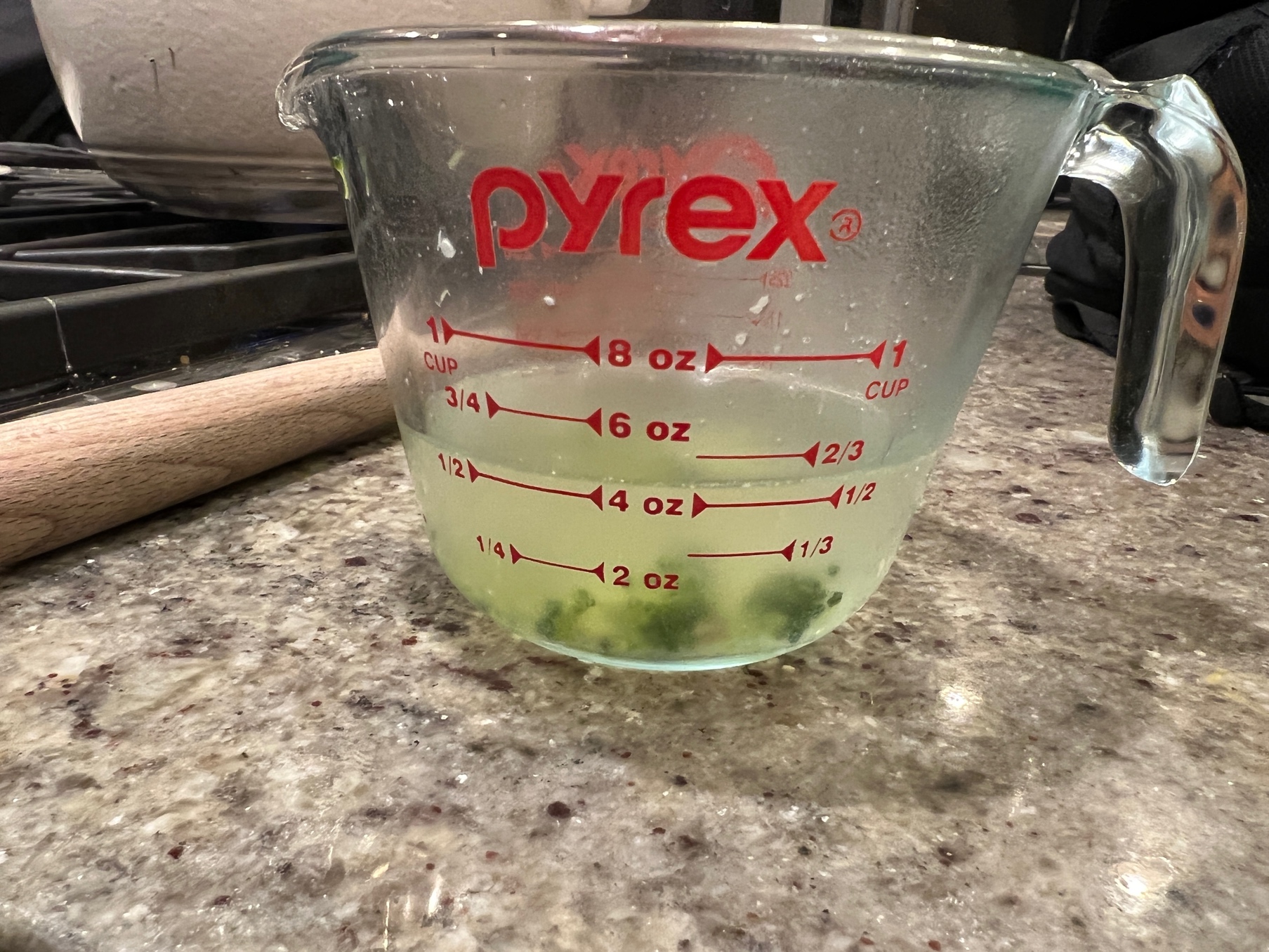 3. Once the macaroni is nearly done, remove about one-half cup of the cooking water and set aside. At the end of the recommended cooking time, drain the pasta and broccoli in a colander.