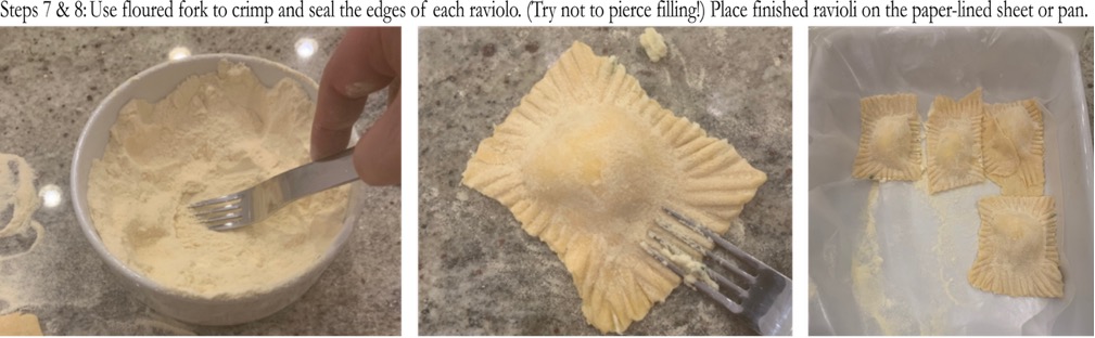 8. For each raviolo, gently push the filling toward the center and then use a floured fork to crimp and seal the edges. Be careful not to fork too closely to the filling as this could also cause the raviolo to rupture during cooking. (This is why we try to create wider borders.)
