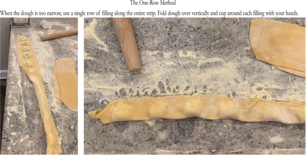 Below, I describe two methods for rolling out and filling the dough: one using the long rolling pin (my now preferred method) and one using the pasta machine. For now, I just show photos the method using the pasta machine.