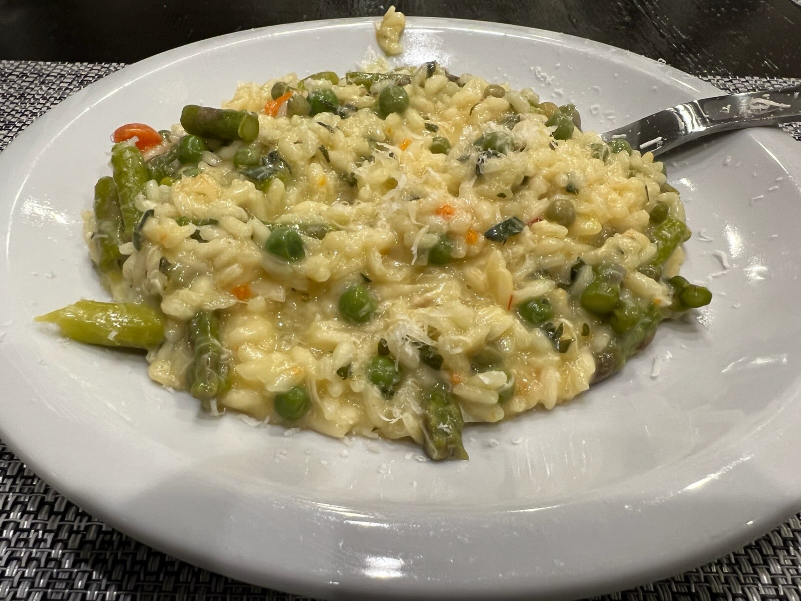 When prepared well, risotti differentiate themselves from other cuisines’ rice dishes by delivering both overall creaminess and granular firmness. This unique texture comes from the varieties of rice used, varieties—such as Arborio, Carnaroli, and Vialone Nano—which release emulsifying starch as they cook without disintegrating into mush. Among these varieties, there are slight differences: Vialone Nano, for example, makes a more al dente risotto, while our preferred Carnaroli makes a creamier one. Our preferred brands are discussed on the Ingredients page. Homemade chicken broth makes a huge difference in the taste over store-bought. The peas and chopped parsley are recent additions and I might try mint at some point. You could turn this into a vegan dish by using vegetable broth, vegan butter, and no cheese (or imitation cheese).