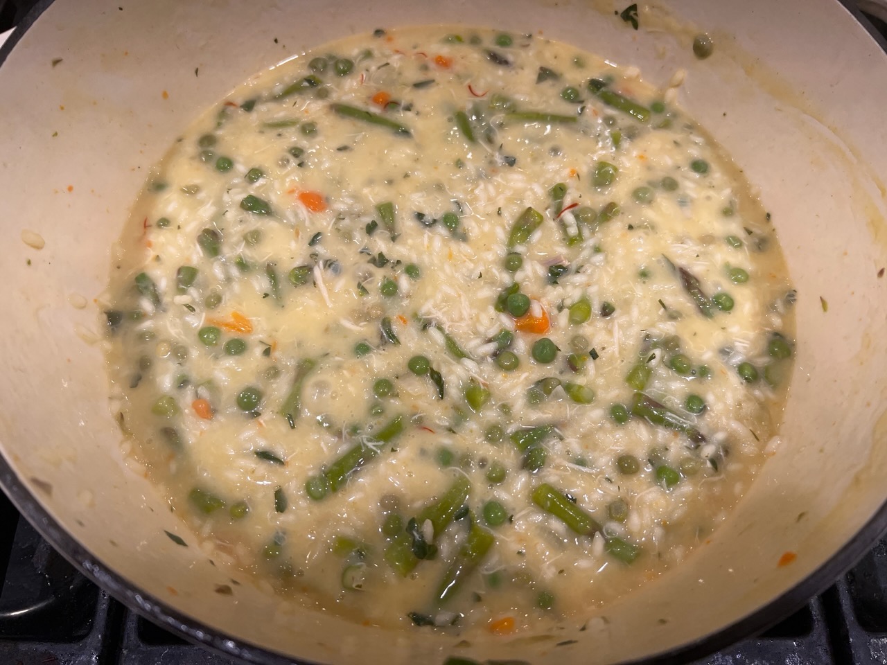 12. When you think the risotto is almost done, stir in the cheese and butter, but not any more broth. Then let 30-40% of the remaining liquid evaporate.