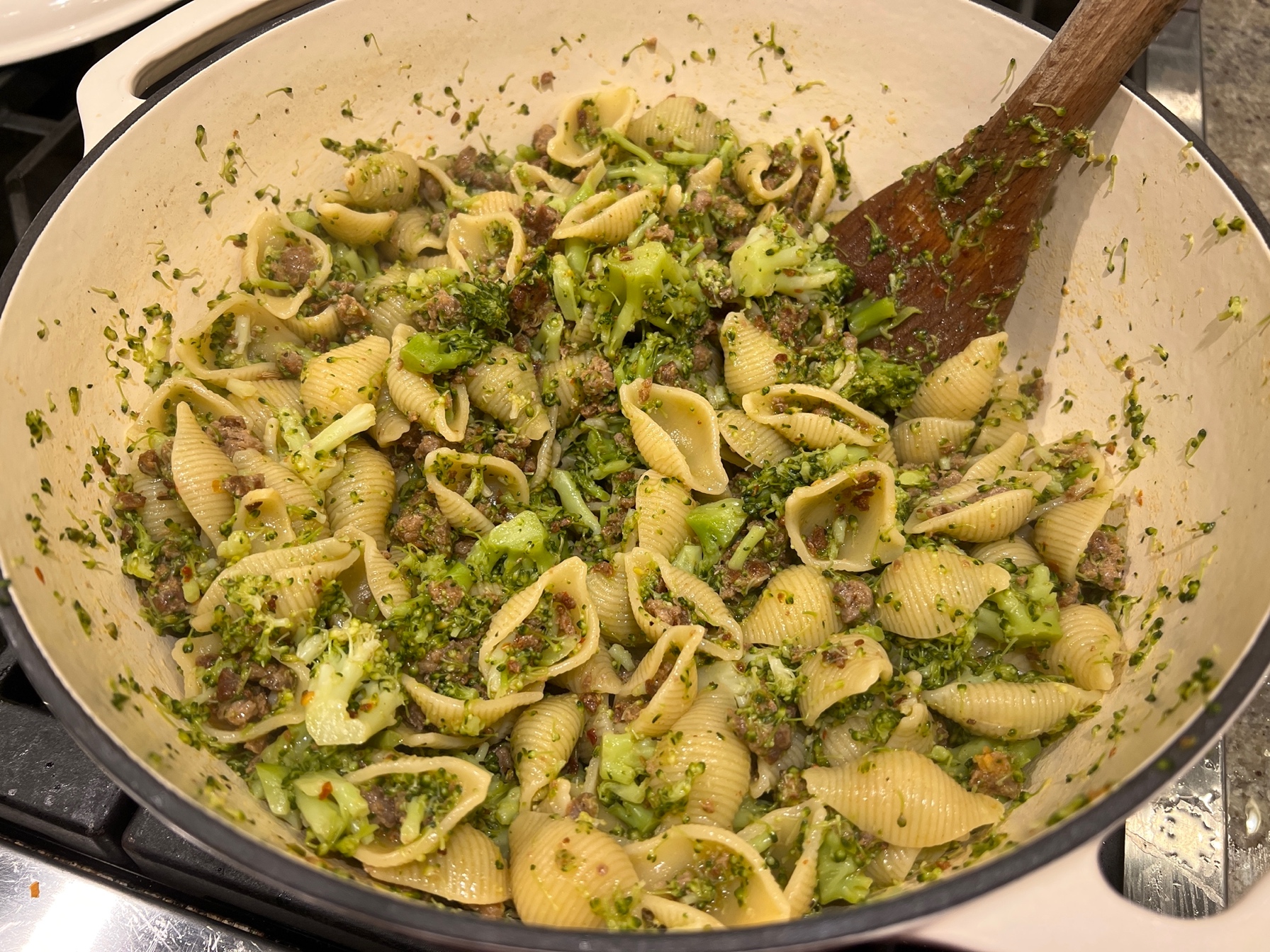 4. In a large serving bowl, mix the macaroni, the broccoli, the sausage, and the reserved cooking water.
