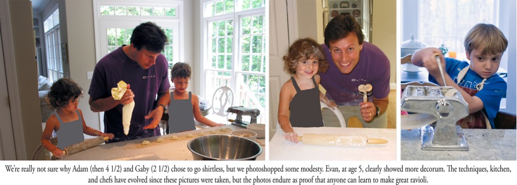 This recipe is my family’s favorite, especially when paired with my mom’s sauce. It was also my first exposure to Italian cooking. My mother initially let me, at age three, turn the crank on the pasta machine. Later I was permitted to seal the ravioli with a fork; and, eventually, I was allowed to do all the tasks. Continuing this tradition, my kids have been helping me since before they were three, and my daughter, Gaby, can now make ravioli better than I can.