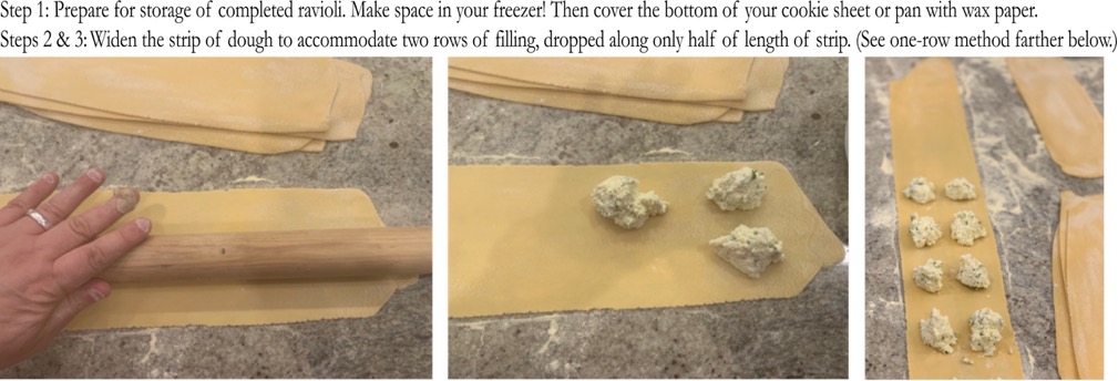 Below, I describe two methods for rolling out and filling the dough: one using the long rolling pin (my now preferred method) and one using the pasta machine. For now, I just show photos the method using the pasta machine.