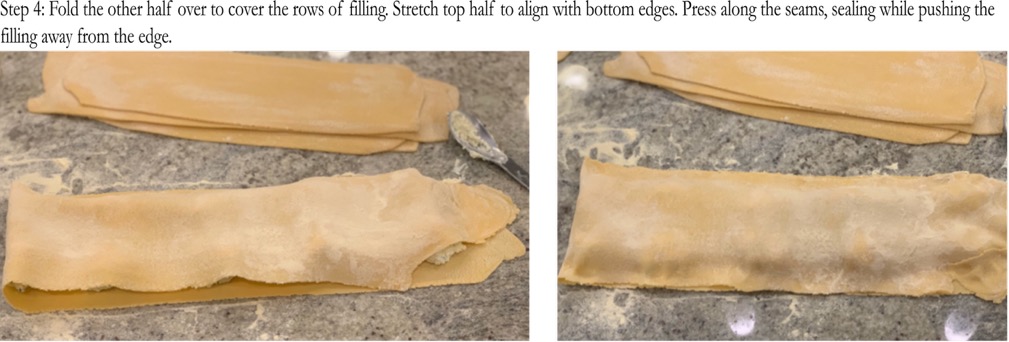 5. Fold the remaining half of dough over horizontally to cover the rows of filling. Stretch the top layer of dough so that its edges align with the bottom layer. Press along the edges to bind the layers of dough together while also pushing the filling away from the edge.