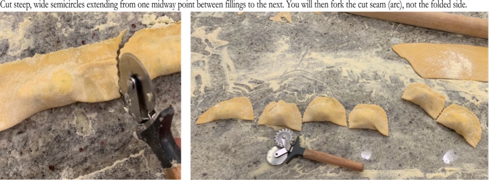7. Use the crinkled edge of the pasta cutter to cut straightl lines between the fillings. Be very careful not to get too close to any filling.